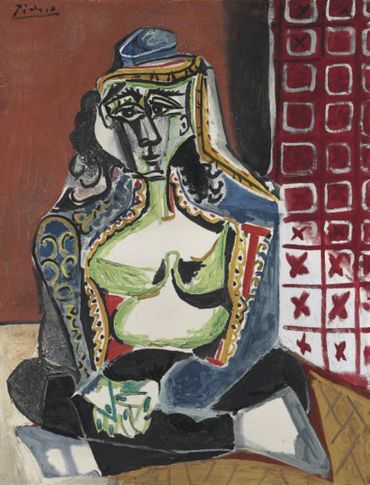 Another painting by Picasso, with a very similar title (“Crouching Woman in Turkish Costume – Jacqueline‘), auctioned, still at Christie’s, for $30 million in 2007.